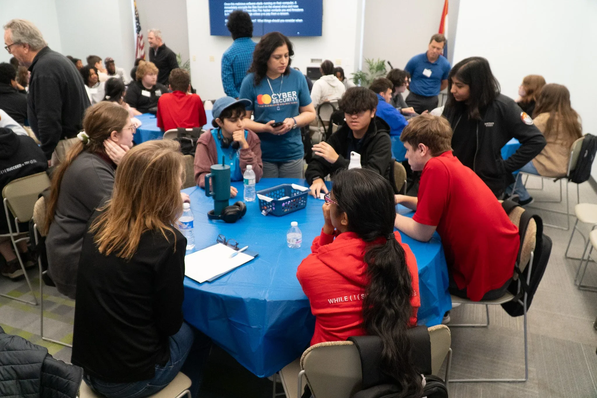 Each domain was explored through guided discussions at individual "Cyber Command Center" tables, where students, alongside their mentors, tackled real-world scenarios. This collaborative approach allowed students to share their solutions with the larger group, promoting best practices and deeper understanding.